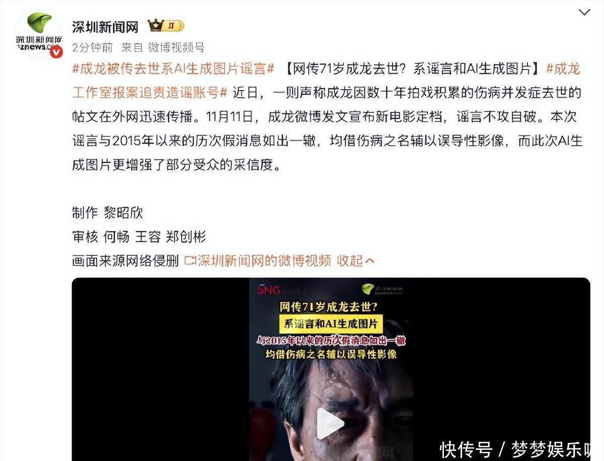 与林雪面对镜头的火爆不同,成龙的遭遇更极端一些,他不是被说“欠钱”,而是直接被“写死”,在外网,有人发布所谓“成龙因长期拍戏伤病并发症去世”的消息,为了增加可信度,还配上一张他躺在病床上的照片,画面里,他穿着病号服,抱着熊猫玩偶,鼻下连着氧气管,看起来“有鼻子有眼”,对不了解情况的人而言,这几乎构成了一则“完整新闻”,于是这条消息被疯狂转发,仿佛一夜之间,人们开始用悼念的语气讨论他,仿佛这个仍旧忙碌的七十一岁老人,已经被按下了“人生终章”的按钮,这种把现实人物强行拖进虚构结局的行为,本质上是一种冷酷的操控。